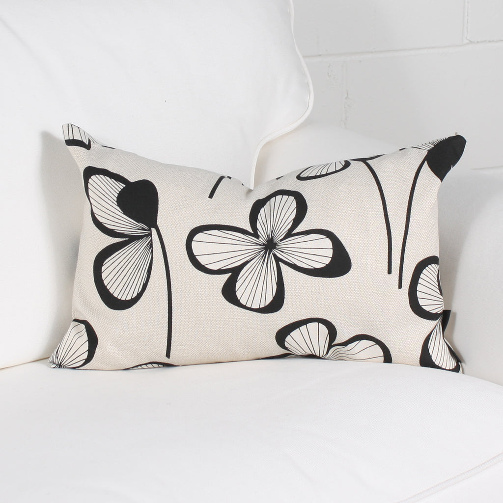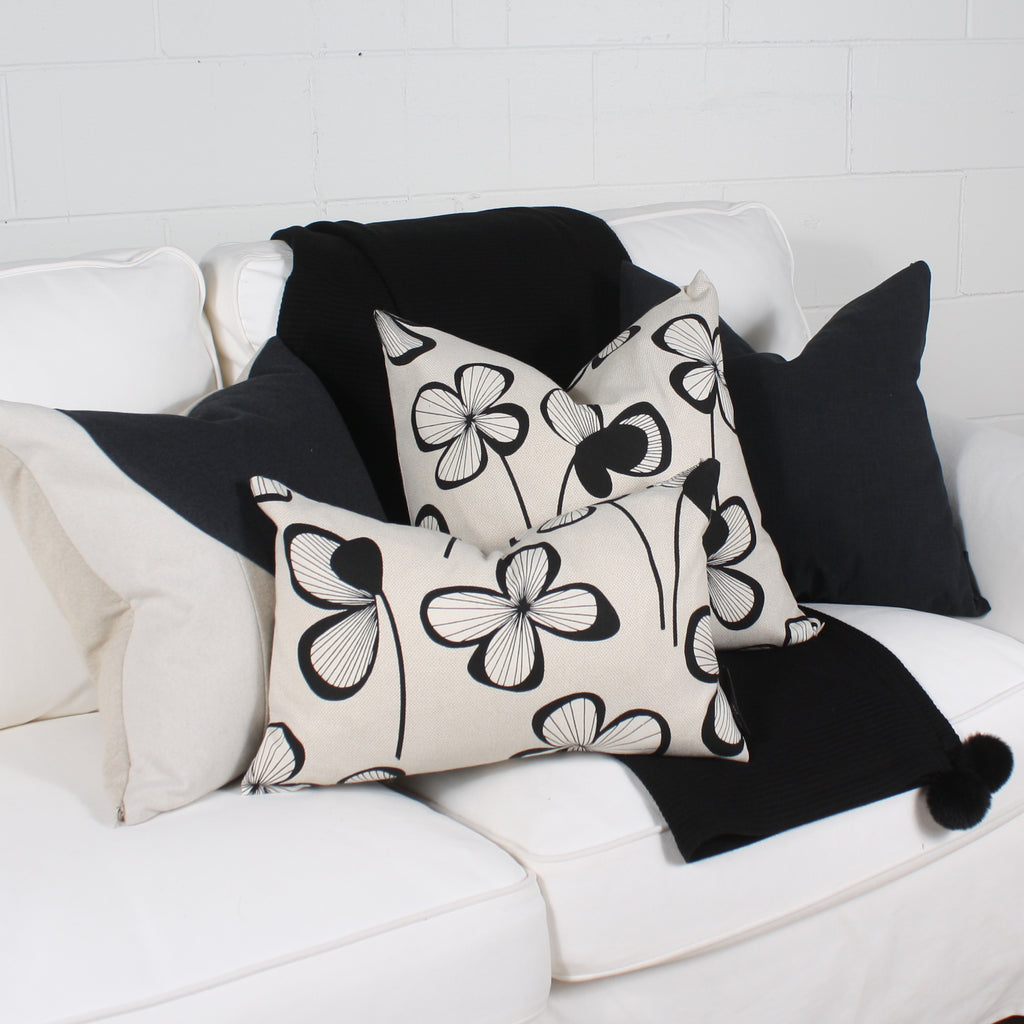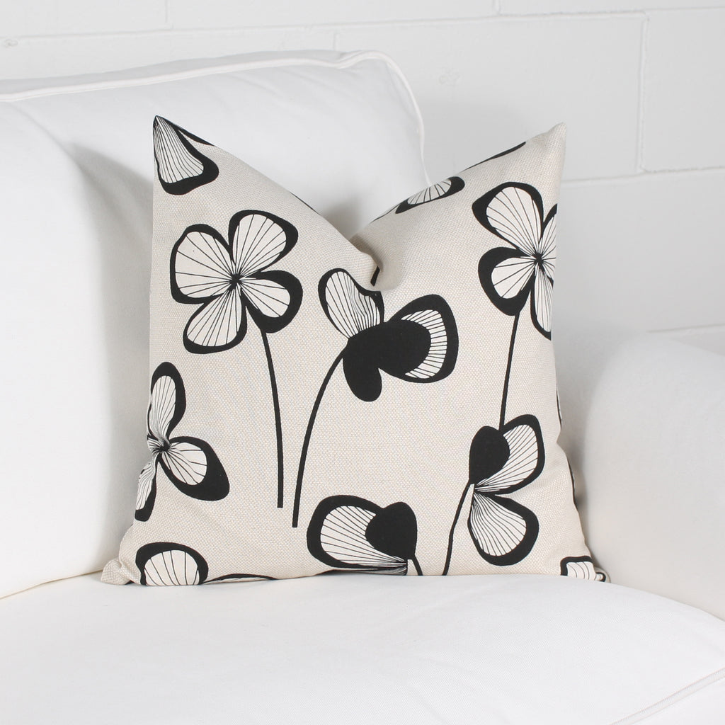 The DENMARK cushion is made from cotton fabric. Its floral pattern is black on a natural beige background.